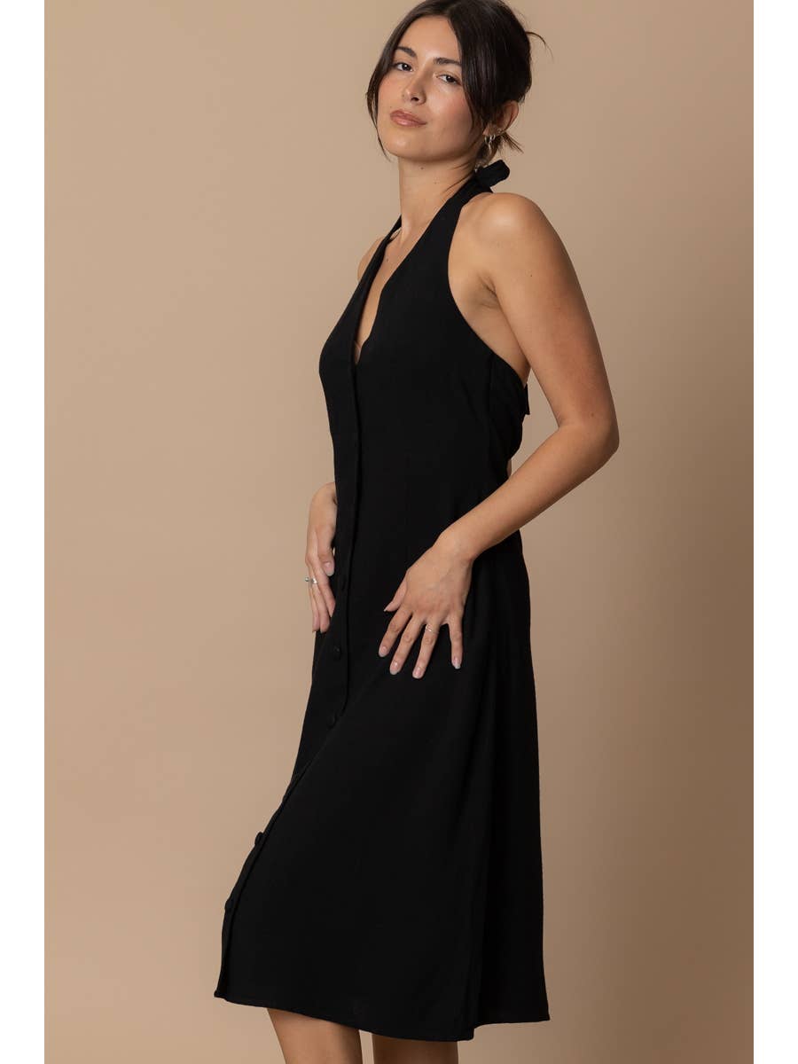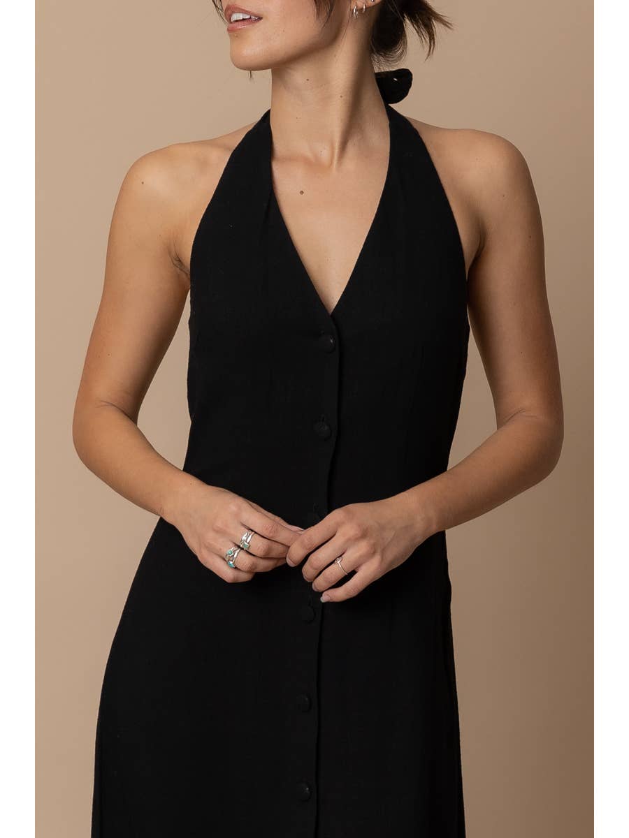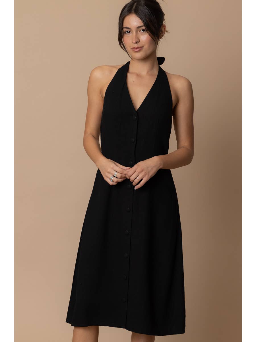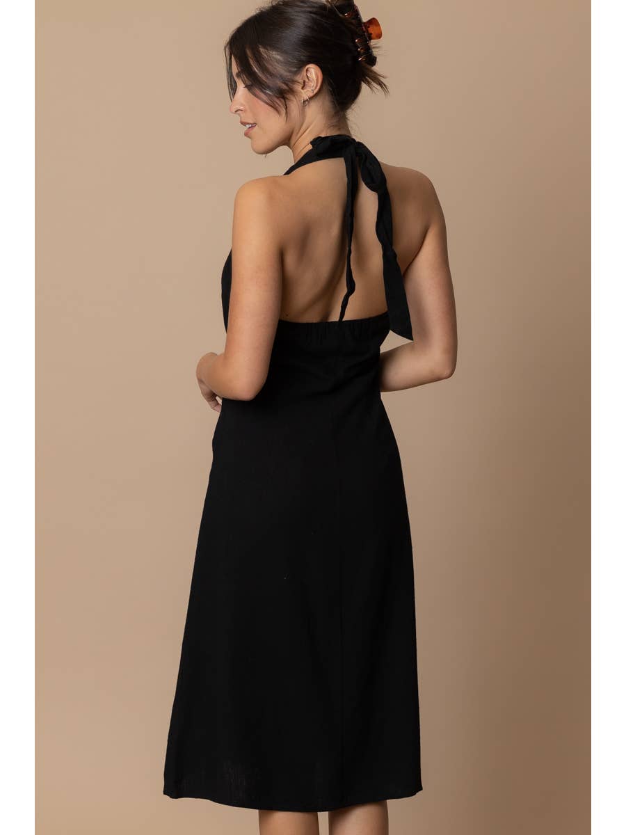 An effortless nod to summer simplicity. Our Halter Neck Button Down Midi Dress is crafted from a breathable blend of 70% viscose and 30% linen, giving it a softly structured drape with an easy, natural movement. The halter neckline adds a flattering, feminine shape, while the button-down front keeps the look grounded and versatile. Light enough for warm days yet polished enough for evening plans — just add simple sandals and delicate jewelry. A timeless piece designed to take you from slow mornings to sunset dinners with ease.