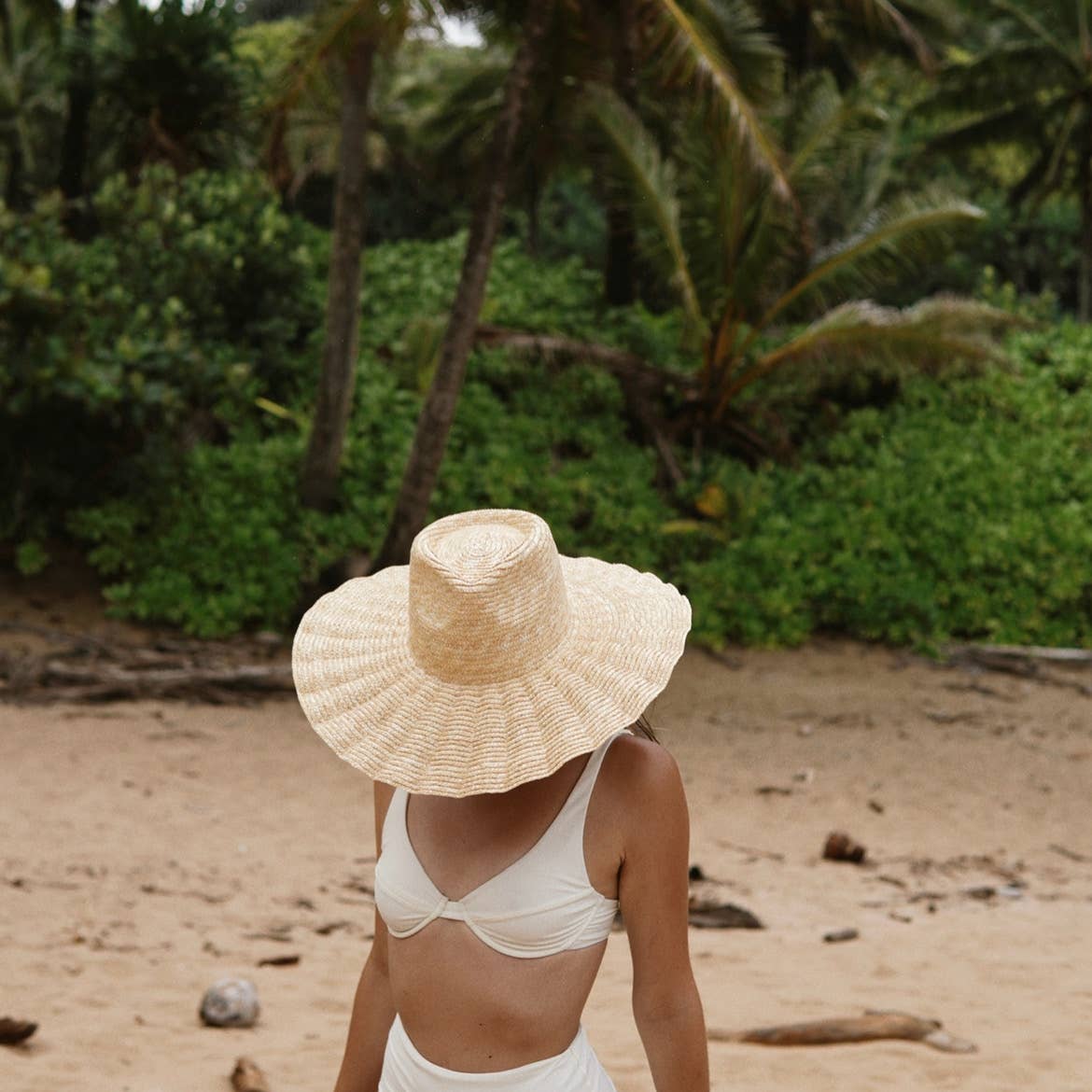Crafted from 100% golden wheat straw, this sun hat features a rancher-style crown and a sculpted wavy brim for full coverage and soft drama. The medium-stiff structure holds its shape beautifully while still feeling lightweight and wearable.